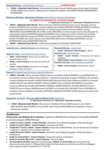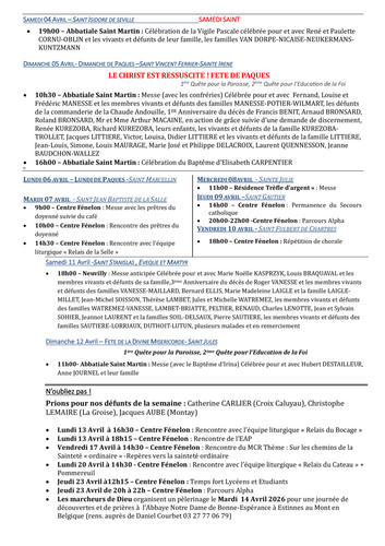 Article publié par response.text()) .then(text => { html = text showLoading = false; })" class="flex justify-center animate-grow-on-hover--small">marylin van dorpe • Publié le Mercredi 01 avril 2026 - 12h00 • 16 visites Annonces de la semaine 15 - 2026 Télécharger 190.2 Ko Télécharger 2 avril 2026 Jeudi Saint Télécharger 447.1 Ko Télécharger 4 avril 2026 veillee Pascale Télécharger 789 Ko Télécharger 05 Avril 2026 Paques Télécharger 523.1 Ko Télécharger